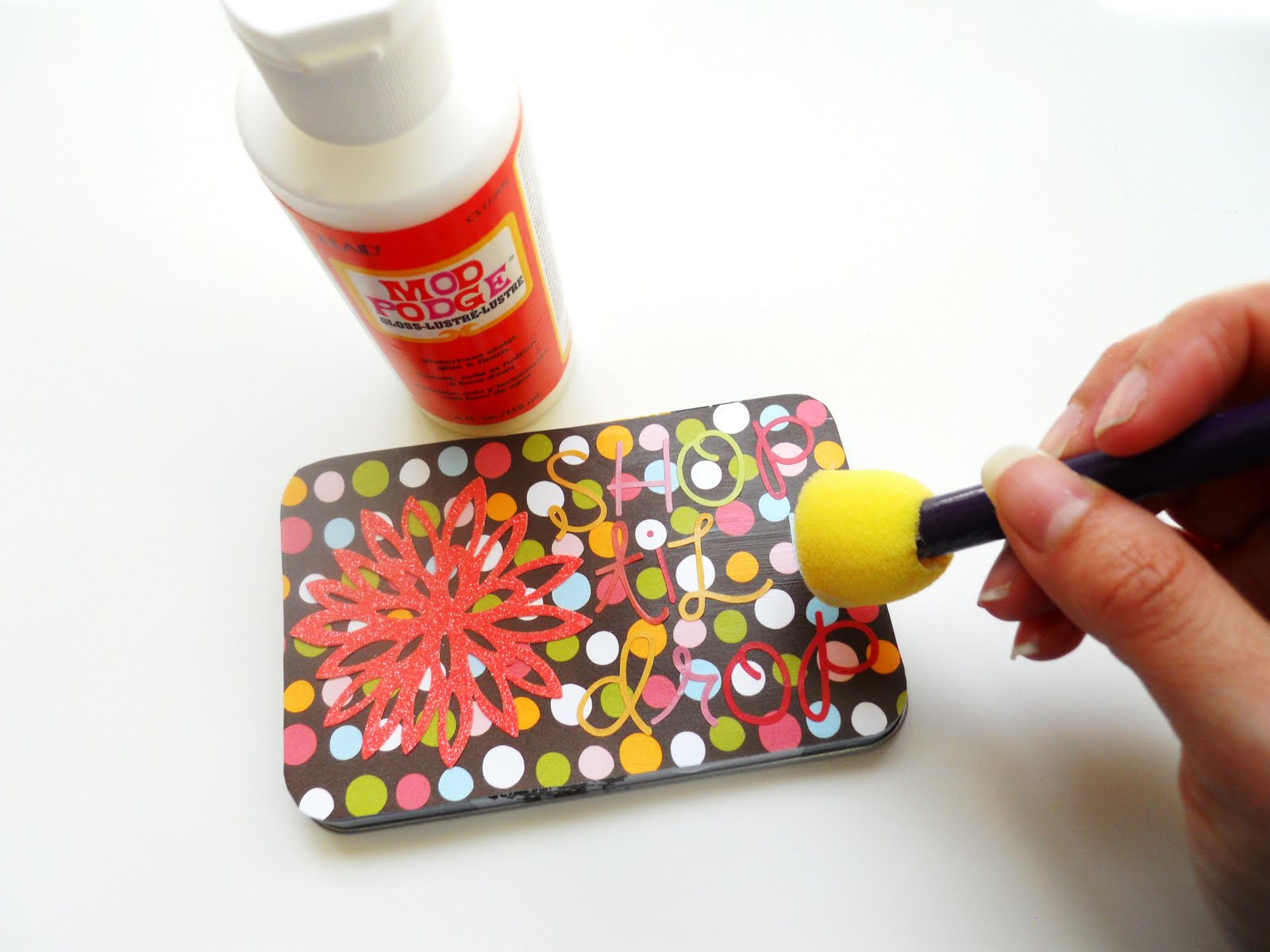 4. Once you have your stickers in place take your sponge and brush a little Modge Podge on the top of the tin lid. Lay your decorated paper down on top of the glue and continue to brush more Mod Podge over the paper and stickers. Let it dry for 15 minutes and then repeat. You may have to repeat this step 2-3 times depending on how well your stickers and paper adheres to the tin lid.