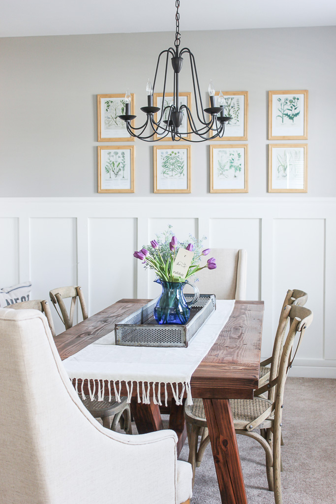For our dining room, my goal was simplicity. Thanks to the gallery wall of botanical prints, a pitcher of purple tulips is really all it needed. The rabbit flashcard was a fun find at